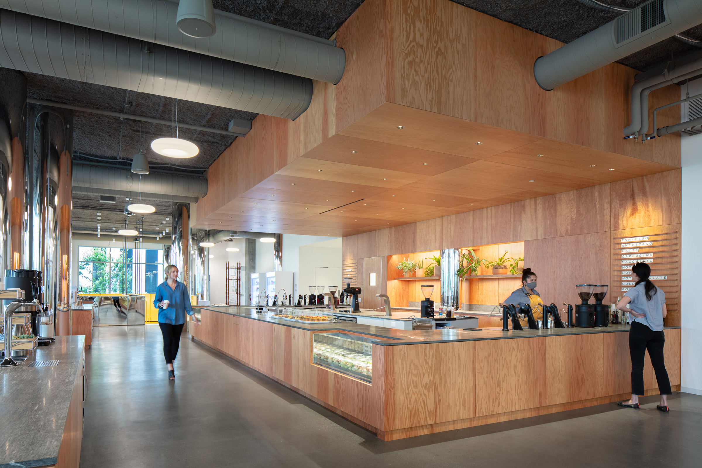 The 10,000 square foot Little R Cafe, located within the Dropbox Headquarters in San Francisco, is a full-service coffee bar and roastery with multiple areas for dining, working, and lounging.